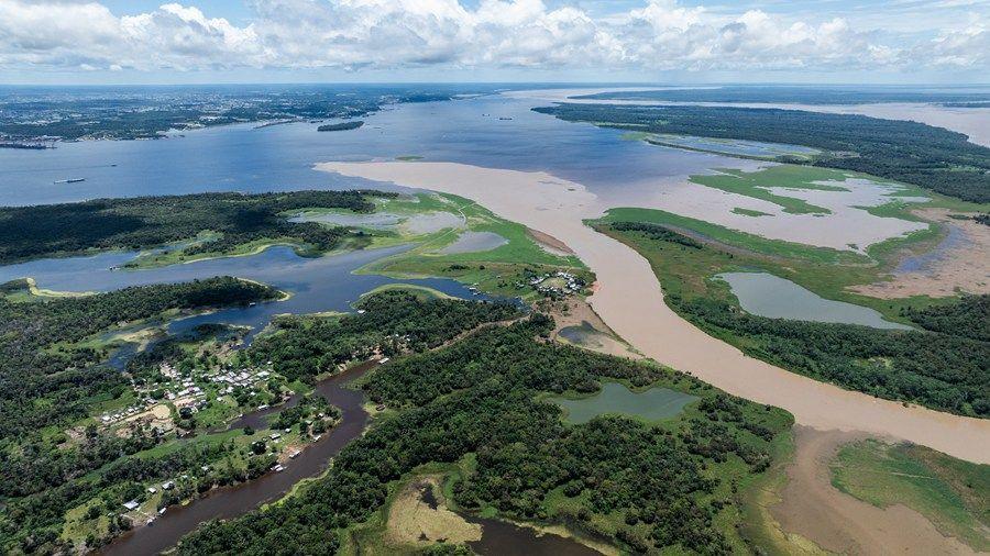这是2024年3月14日在巴西亚马孙州首府马瑙斯附近拍摄的亚马孙河流域风光(无人机照片)。新华社记者 王天聪 摄
