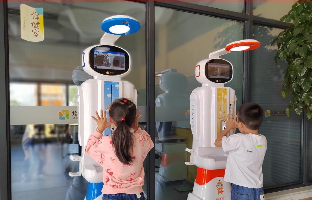 温馨轻松的氛围背后,暗藏科技。大概过了5秒钟,毛毛的妈妈郭娟娟手机就“嘀”一声,收到了孩子的体检信息,体温、身高、体重等健康数据一目了然,这让在附近工厂上班的郭娟娟十分放心。