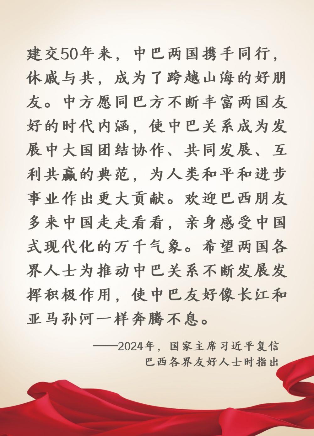 2023年4月,习近平主席同来华进行国事访问的巴西总统卢拉举行会谈时,谈到双方要以2024年庆祝建交50周年为契机,继续推动中巴友好。