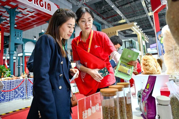 11月7日,一名观众(左一)在第七届进博会国家展秘鲁馆了解秘鲁咖啡。 新华社记者 张铖 摄