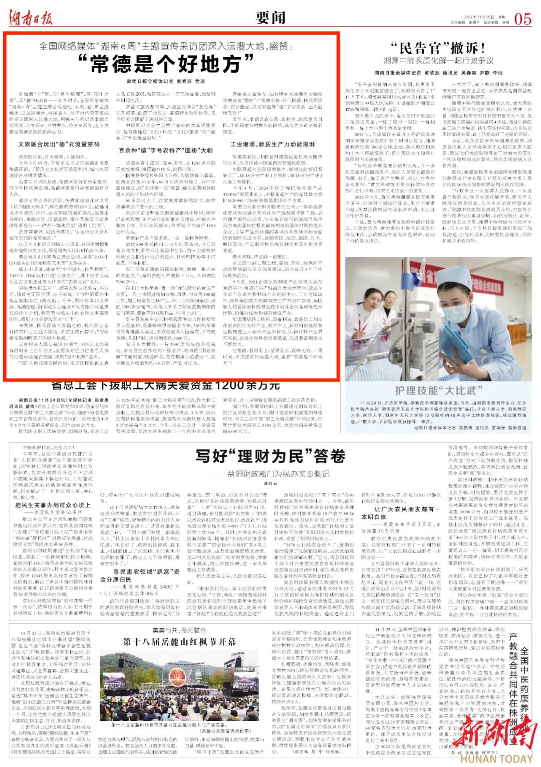 全国网络媒体“湖南e周”主题宣传采访团深入沅澧大地,盛赞:“常德是个好地方”@湖南日报要闻版头条