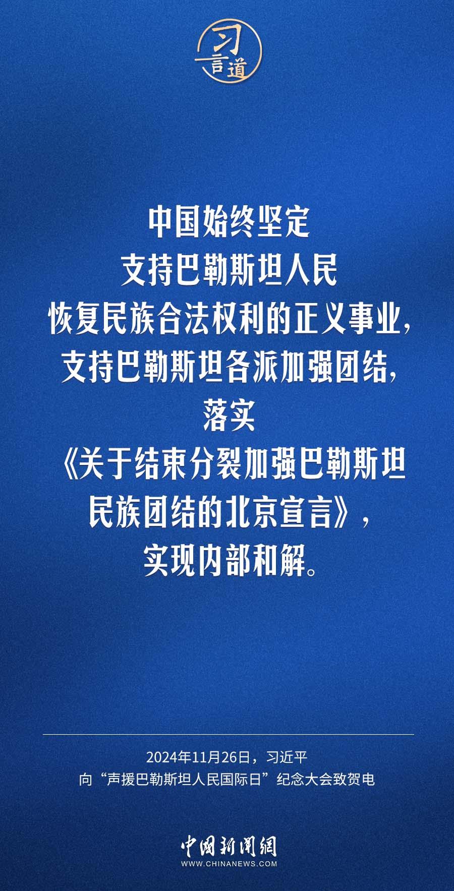 11月26日,联合国举行“声援巴勒斯坦人民国际日”纪念大会,国家主席习近平向大会致贺电。习近平指出——