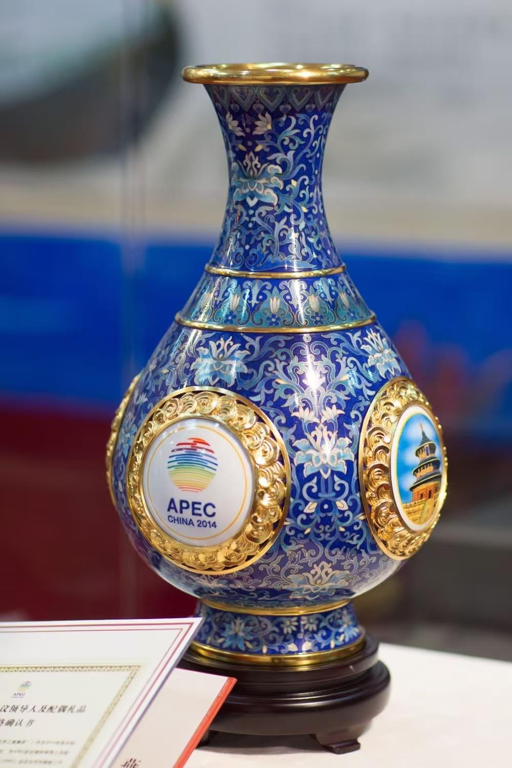 2014年11月,北京APEC会议在雁栖湖畔举行。为欢迎参会的各经济体领导人,习近平主席选定了一件国礼——“四海升平”景泰蓝赏瓶。赏瓶的细节蕴含巧思:瓶高38厘米,是天坛祈年殿38米的等比例缩小;最大直径21厘米,代表APEC的21个经济体。碧蓝的瓶身雕着水纹,既象征“四海”也代表环太平洋。“瓶”是“平”的谐音,连起来即“四海升平”。