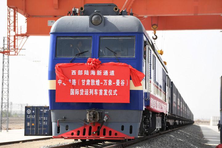 甘肃首趟中老铁路国际货运列车在敦煌市铁路西货站综合货场等待发车(2022年4月21日摄)。 新华社记者 陈斌 摄