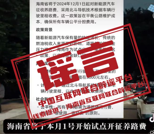 真相:近日,一些自媒体炒作“海南将于2024年12月1日起对新能源汽车征收养路费”的消息,引发关注。12月5日,海南省交通运输厅工作人员回应称相关消息是假消息。截至目前,海南从未发布过收取新能源车辆的车辆通行附加费相关政策。(来源:@海南网络举报、“海南省交通运输厅”微信公众号、南海网)
