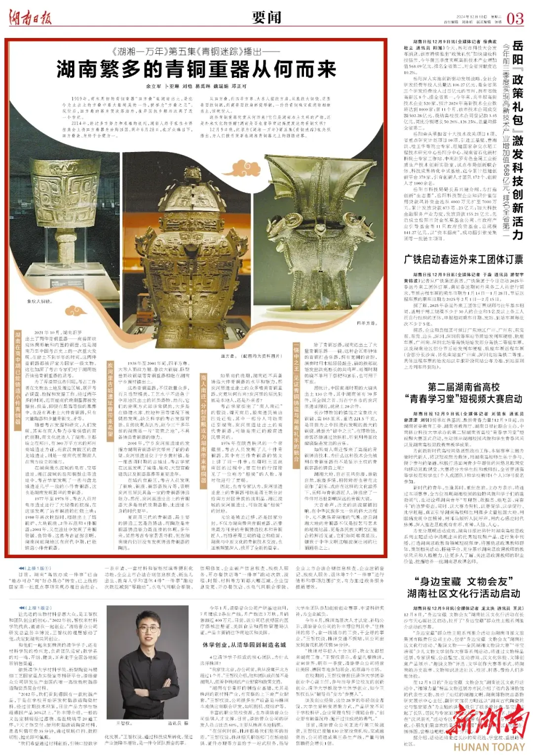 12月9日晚,纪录片《湖湘一万年》第五集《青铜迷踪》在央视播出,为人们拨开笼罩在湖湘青铜器之上的团团迷雾。