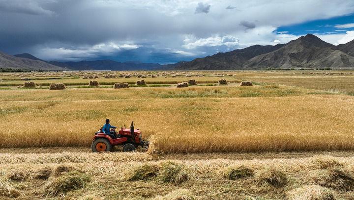 2024年9月10日在西藏日喀则市白朗县巴扎乡拍摄的秋收场景(无人机照片)。新华社记者 晋美多吉 摄