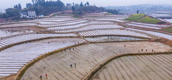 2024年3月6日,在四川省广安市前锋区观塘镇仁和村,农民在高标准农田育秧(无人机照片)。新华社发(周修建摄)