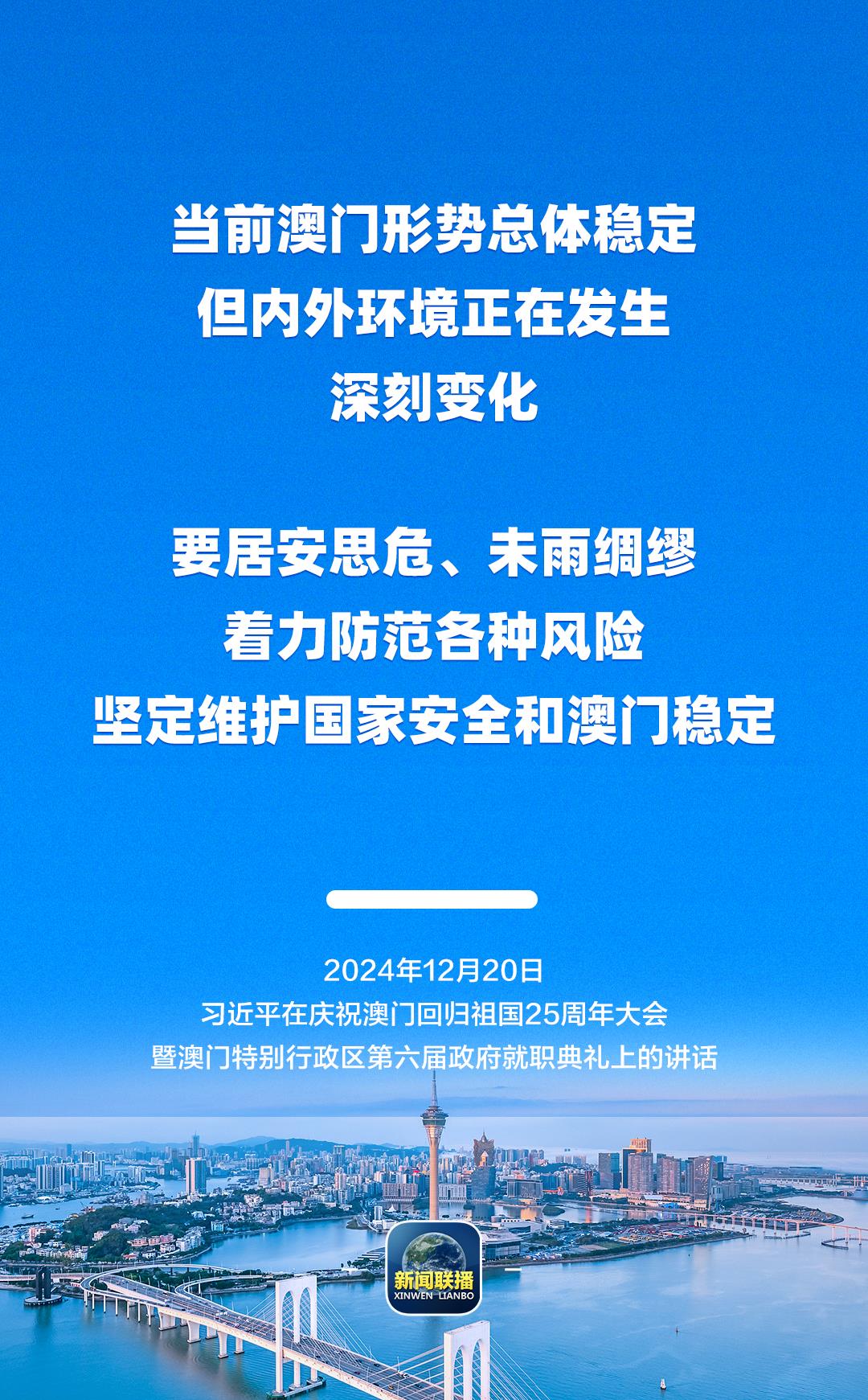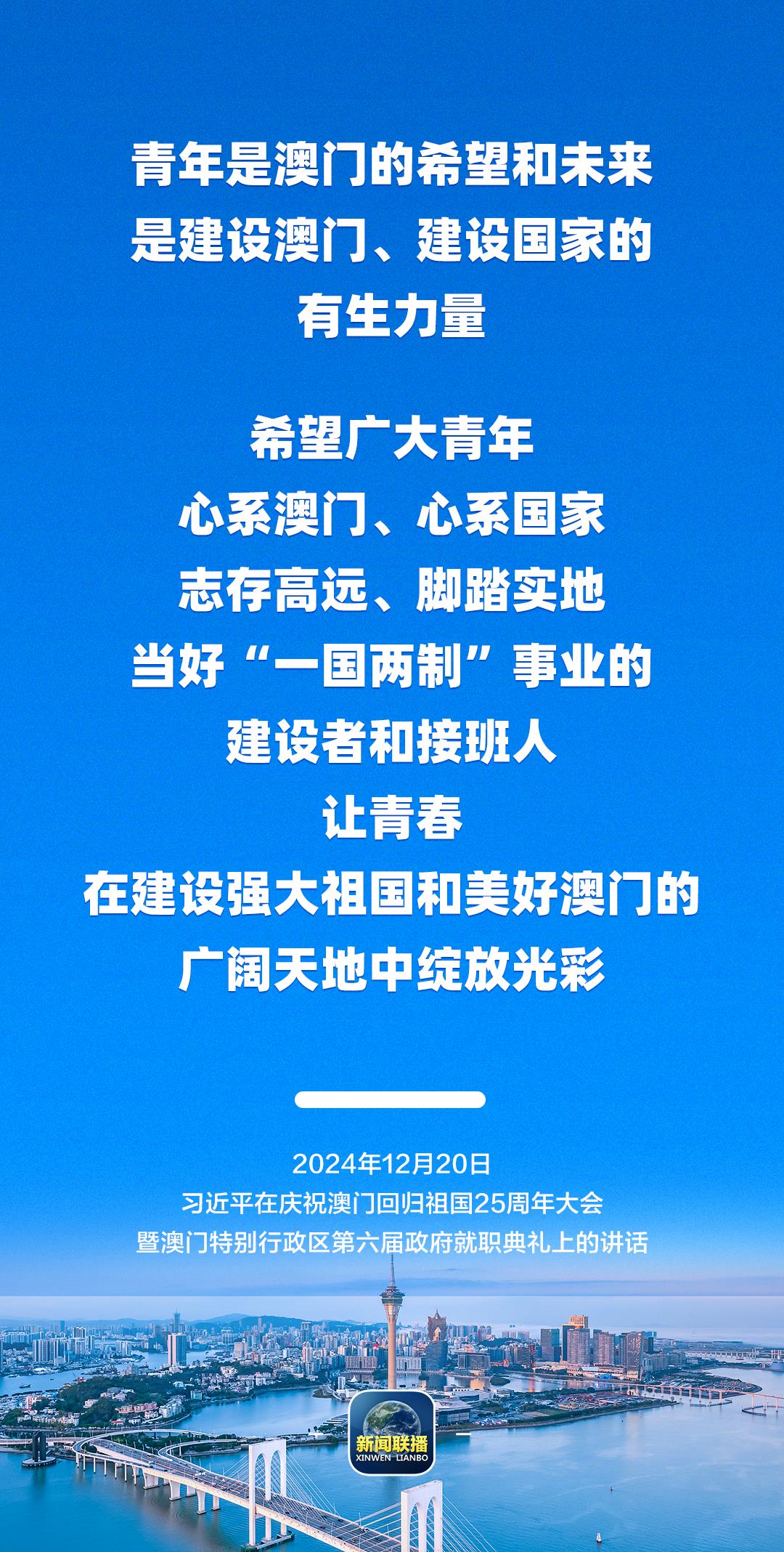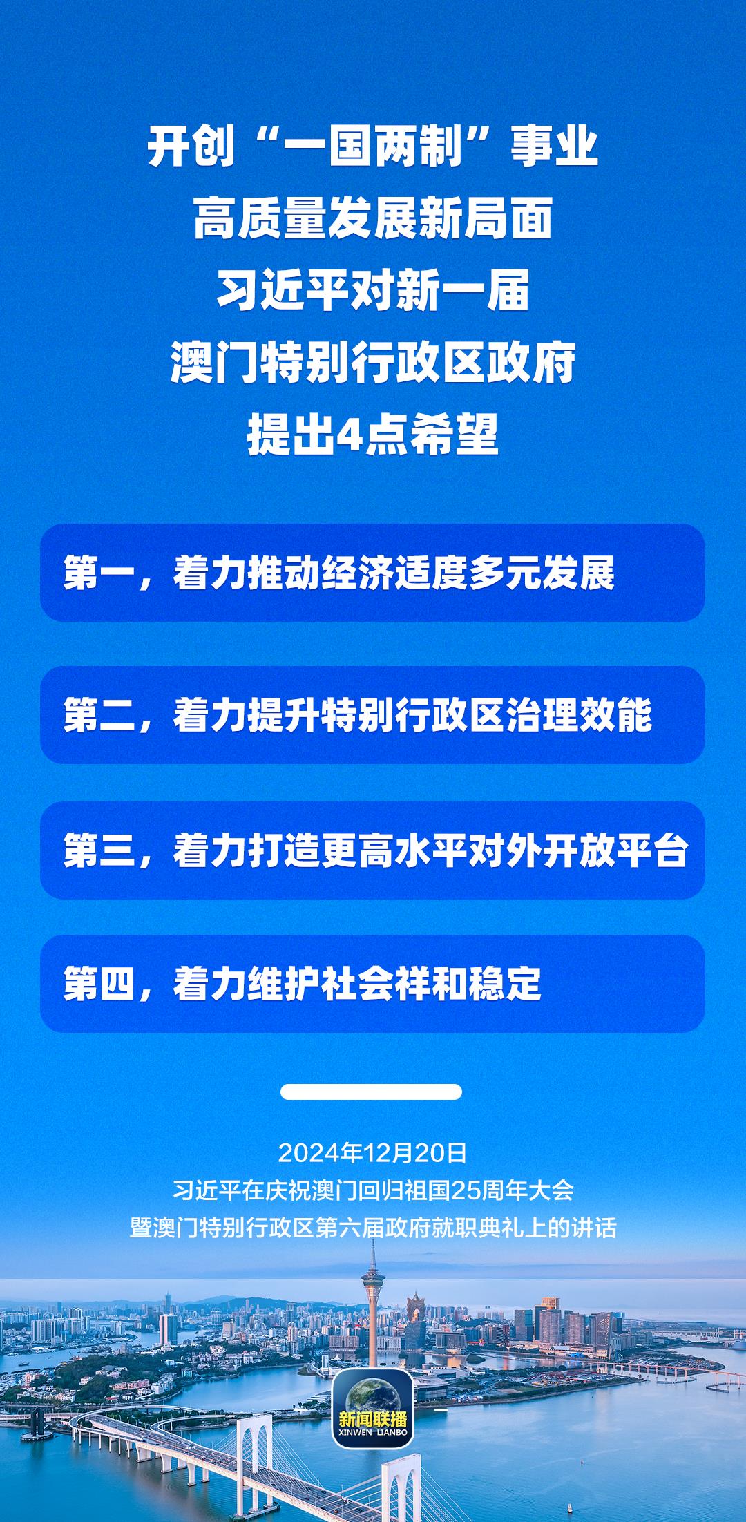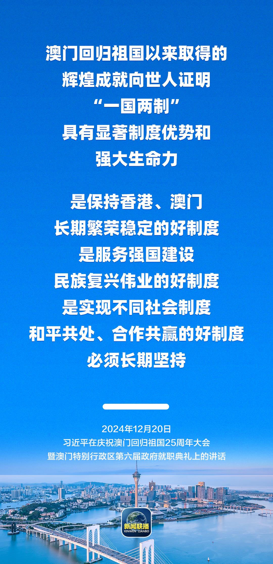 习近平强调,只要全面准确、坚定不移贯彻“一国两制”方针,有特别行政区政府和社会各界共同努力,有伟大祖国作坚强后盾,澳门一定能打开发展新天地、不断创造新辉煌,一定能为以中国式现代化全面推进强国建设、民族复兴伟业作出更大贡献。