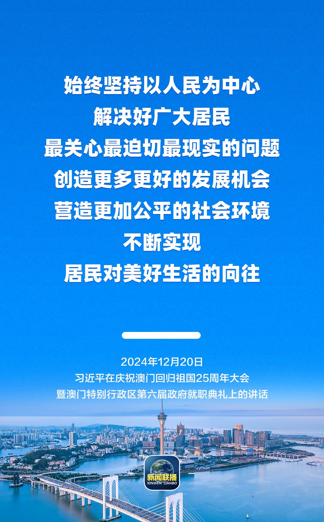 12月20日上午,庆祝澳门回归祖国25周年大会暨澳门特别行政区第六届政府就职典礼举行。中共中央总书记、国家主席、中央军委主席习近平出席并发表重要讲话。