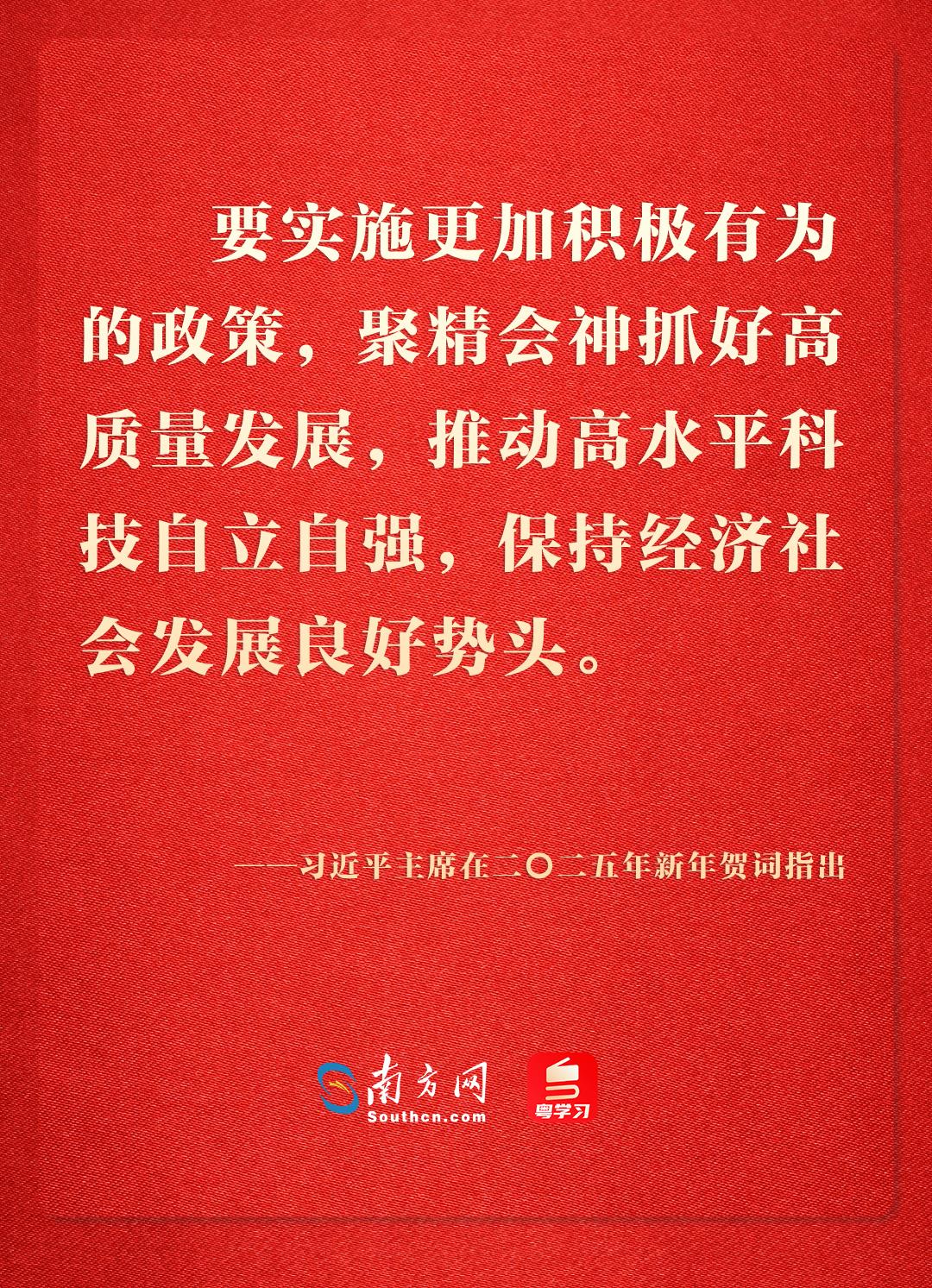 他指出:“要实施更加积极有为的政策,聚精会神抓好高质量发展,推动高水平科技自立自强,保持经济社会发展良好势头。”