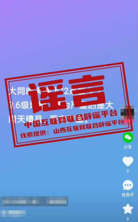 真相:近日,有网民在社交平台发布视频称“大同1月6日晚上12点发生了9.6级地震,最为严重的是大同天镇县,受灾最严重”,引发社会关注。对此,大同市防震减灾中心发布辟谣信息表示,经向山西省地震局查询,该时段在大同市天镇一带未发生过有感地震,该视频所述纯属谣言。(来源:山西互联网联合辟谣平台)