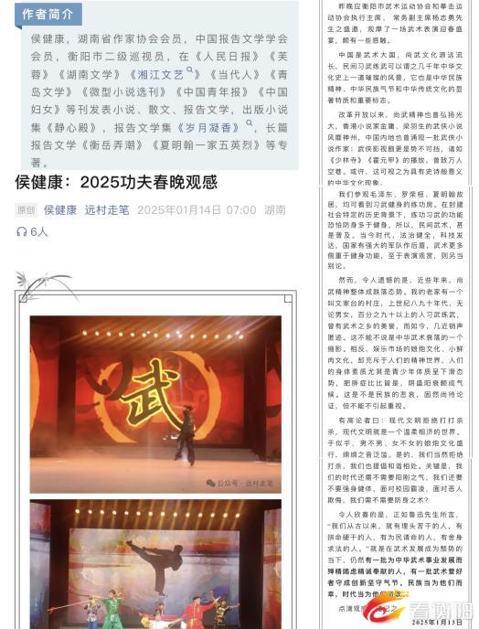 在璀璨的灯光与雷鸣般的掌声中,“紫晶生物”衡阳市2025年功夫春晚圆满落下帷幕。功夫春晚不仅展现了中华武术的博大精深,更深刻诠释了新时代背景下武术文化的传承与创新。几天过去,这场武术文化盛宴激发的文化涟漪与民族自豪感还在持续荡漾,成为新年伊始的一道亮丽风景线。湖南省作协会员、市委二级巡视员侯健康在受邀观看整台晚会后有感而发,于个人公号上发表了题为《2025功夫春晚观感》文章,尤为引人深思。