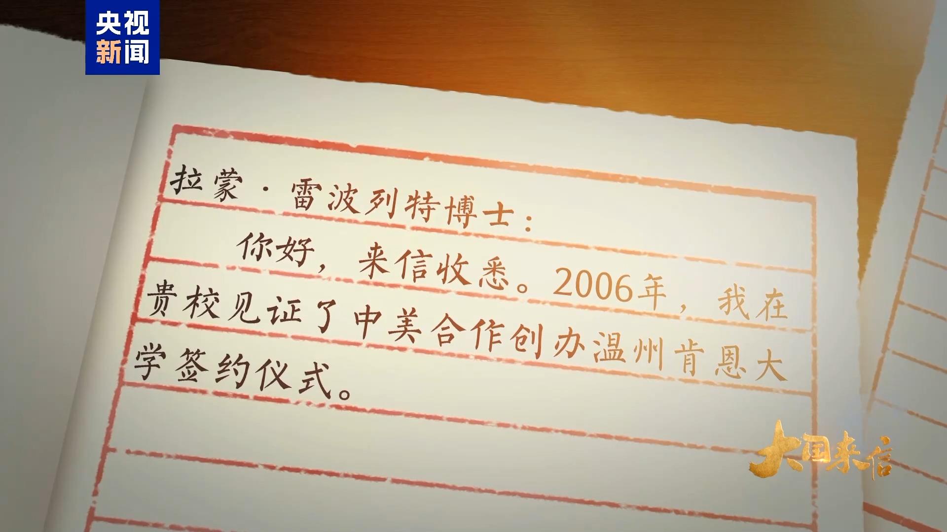 锦书云中来,尺牍传深情。2006年,时任浙江省委书记习近平在美国肯恩大学见证了中美合作创办温州肯恩大学的签约仪式。自2014年设立以来,温州肯恩大学不仅培养了数千名中外学子,还推动了中美两国青年一代的友好交流。去年6月,习主席复信美国肯恩大学校长拉蒙·雷波列特,鼓励中美两国高校加强交流合作,为促进中美友好贡献力量。