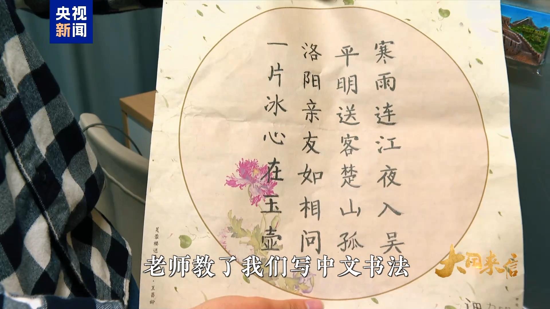美国肯恩大学学生 亚历山德罗·迪·雷奥:这些汉字是我们在中文课上写的,老师教了我们写中文书法,我们就写了这些。
