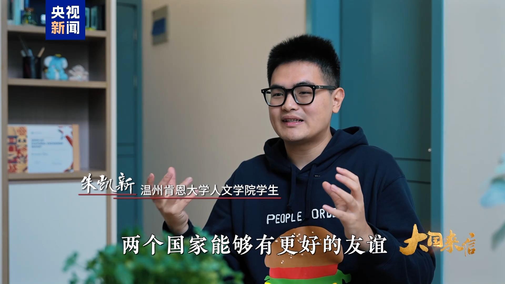 温州肯恩大学人文学院学生 朱凯新:我也是非常非常期待每一位美国朋友来到我们中国,来到我们真正的这块土地上去看看我们到底是什么样子的。我希望能够让中国和美国两个国家能够有更好的友谊。