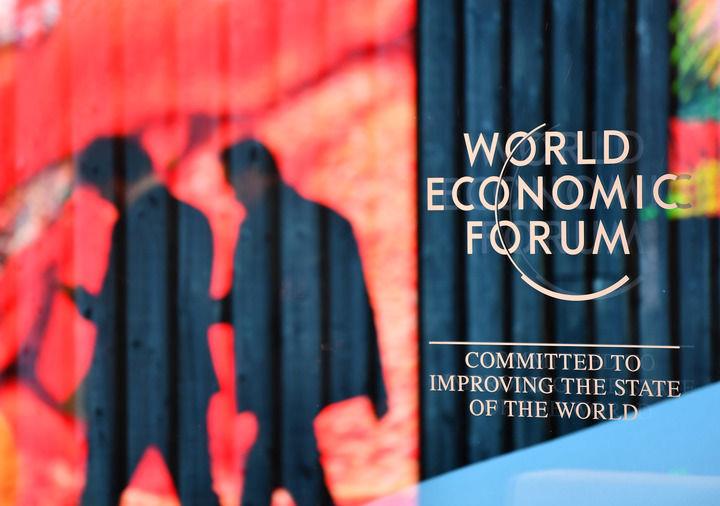 2024年1月14日,在瑞士达沃斯,人们走过世界经济论坛标识。新华社记者 连漪 摄
