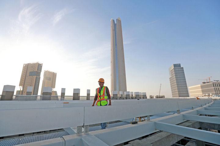 这是2023年11月22日在埃及开罗以东的埃及新行政首都中央商务区拍摄的一名在高楼楼顶施工的中国工人。新华社记者 隋先凯 摄