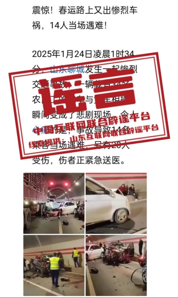 真相:近日,有网民在网络平台发布一则“山东聊城一隧道内发生多车相撞”的信息,称“现场多车发生严重碰撞,场面惨烈,群众滞留”,引发关注。经当地警方核实,山东省聊城市从未发生过类似交通事故,该信息内容纯属虚假编造。经查,网民褚某某和韩某为博取关注、吸引流量,将外省市发生交通事故的图片视频移花接木,称“聊城发生交通事故”并凭空捏造伤亡人数,造成不良影响。目前,二人已被公安机关依法打击处理。(来源:山东互联网联合辟谣平台、聊城市网上辟谣平台)