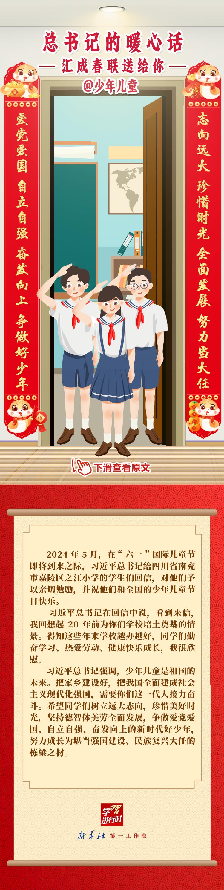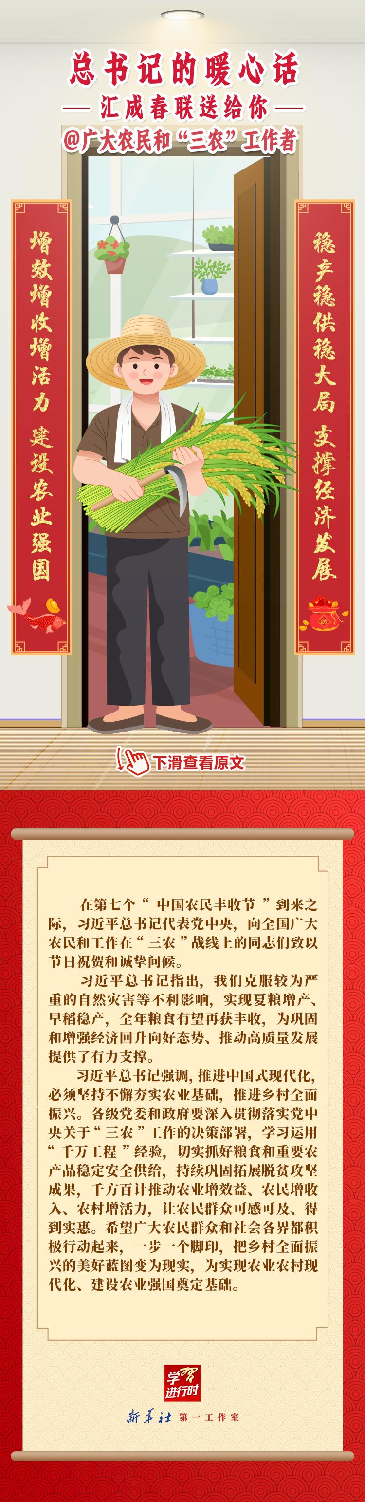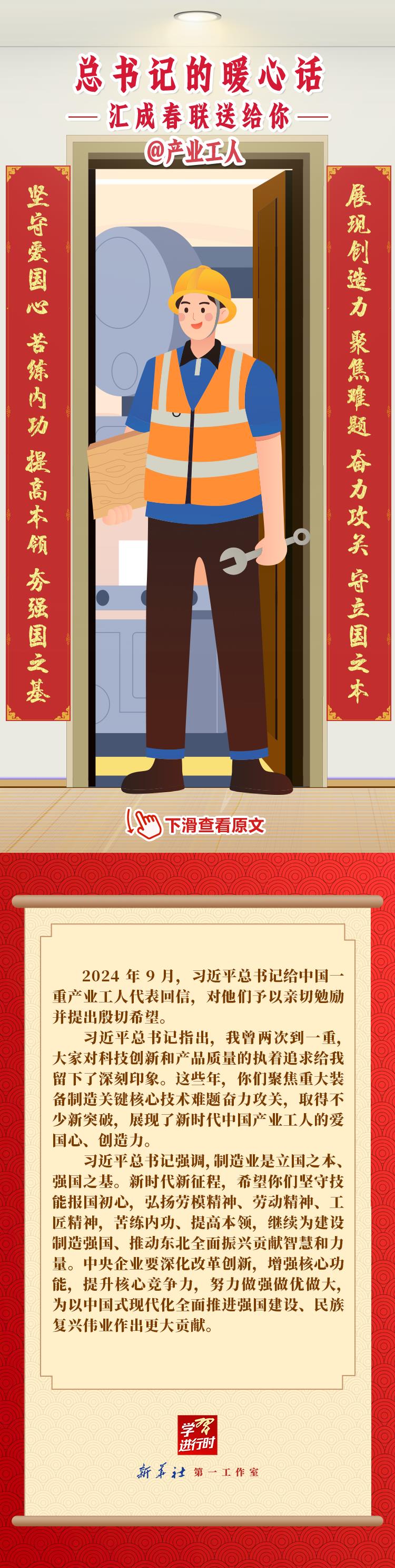 【学习进行时】过春节,贴春联,寄托人们对新年的美好愿望。过去一年,习近平总书记在不同场合点赞各行各业奋斗者,说了许多暖心话。新春之际,我们汇编成联,向新征程上的每一位“主角”致敬,送上新春的祝福。
