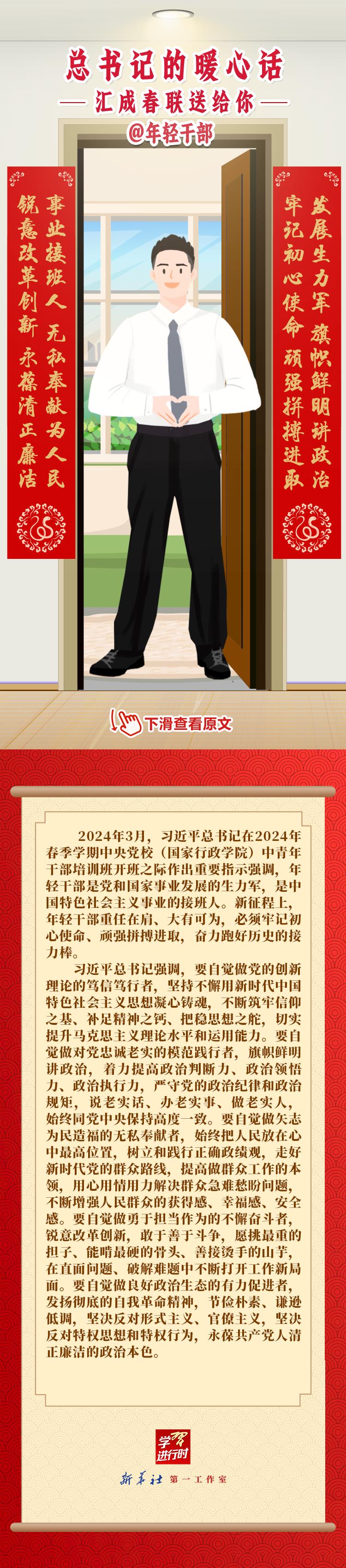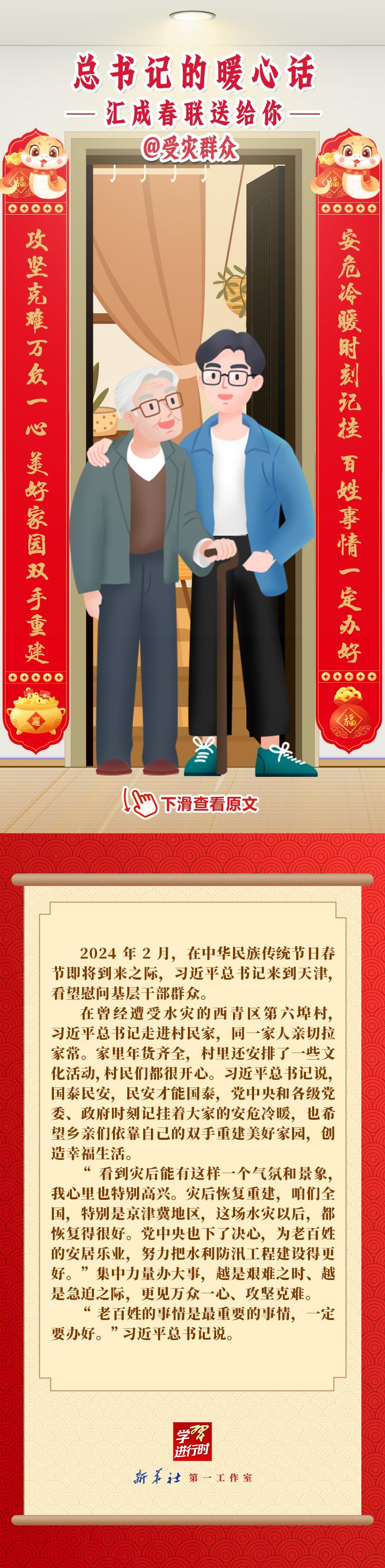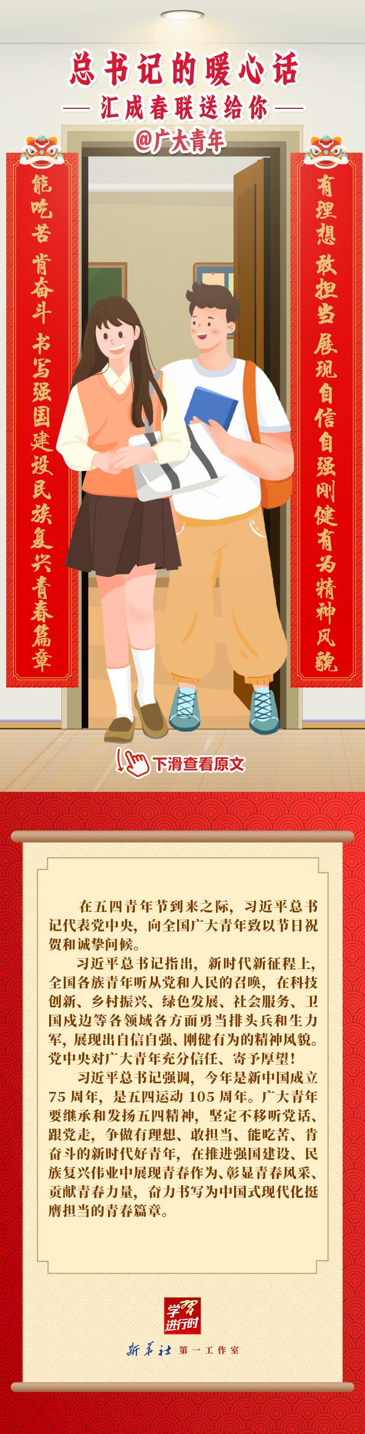【学习进行时】过春节,贴春联,寄托人们对新年的美好愿望。过去一年,习近平总书记在不同场合点赞各行各业奋斗者,说了许多暖心话。新春之际,我们汇编成联,向新征程上的每一位“主角”致敬,送上新春的祝福。