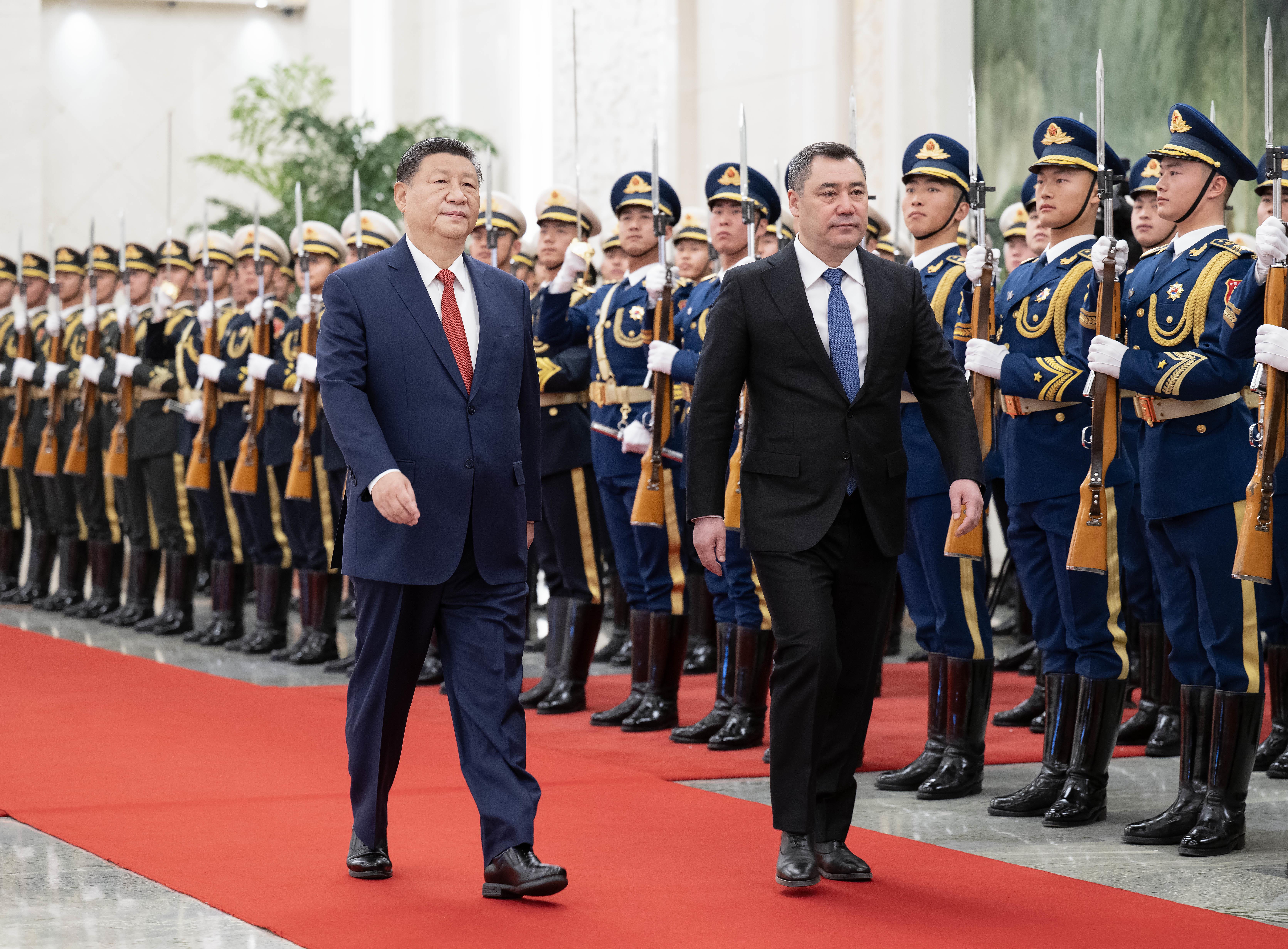 天安门广场鸣放21响礼炮,礼兵列队致敬。两国元首登上检阅台,军乐团奏中吉两国国歌。扎帕罗夫在习近平陪同下检阅中国人民解放军仪仗队,并观看分列式。