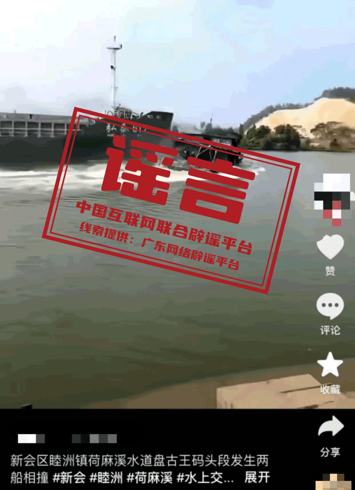真相:近日,有网民在短视频平台配文发布“新会区睦洲镇荷麻溪水道盘古王码头段发生两船相撞”的视频,称事发于1月26日,引发关注。经广东省江门市新会区公安机关调查,确认当日新会区睦洲镇并未发生两船相撞的事故,该信息为谣言。经审讯,网民方某对自己为获取流量和关注,在短视频平台发布谣言的违法行为供认不讳。目前,新会公安机关已依法对方某作出行政处罚。(来源:“广东省互联网举报中心”微信公众号、江门网警)