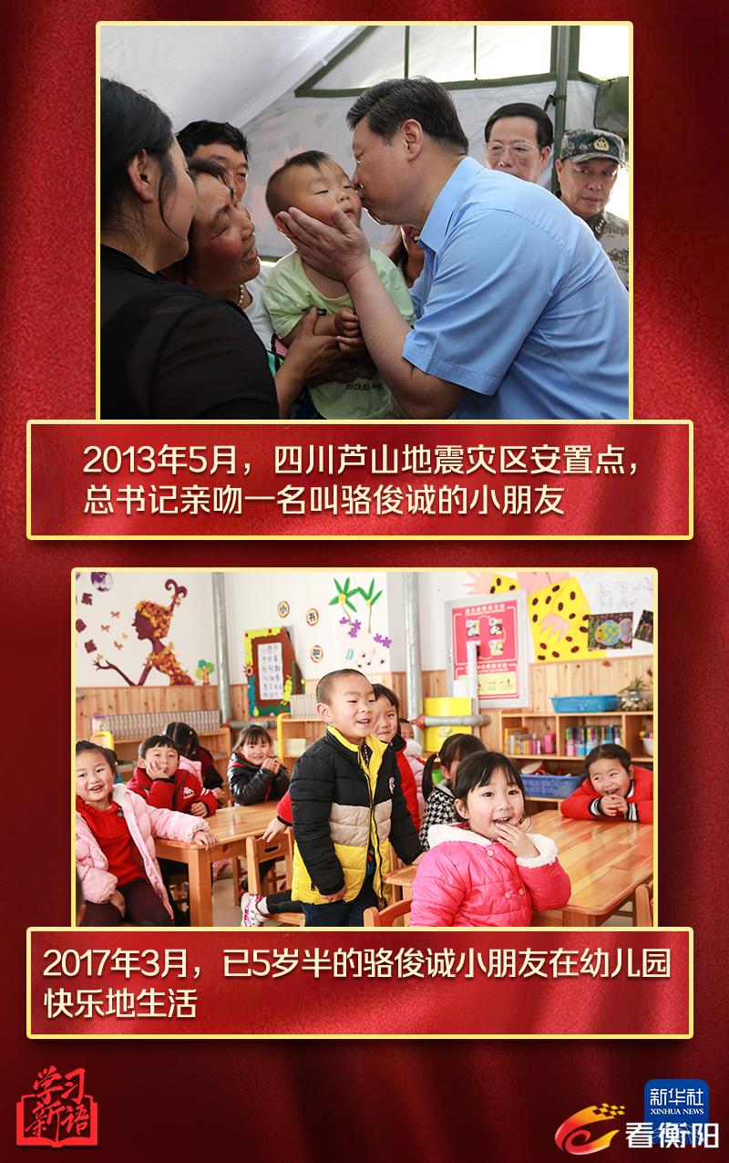 2013年芦山地震发生后,总书记亲赴灾区看望慰问受灾群众。在芦山县体育馆安置点帐篷内,总书记用手捧着1岁多的骆俊诚小朋友的小脸蛋,轻轻亲吻。看着数年后的照片中,已经5岁半的小家伙在芦山县幼儿园快乐地生活,总书记脸上露出欣慰的笑容。