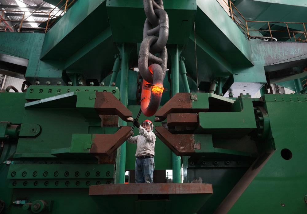 2024年6月4日,江苏泰州靖江市江苏亚星锚链股份有限公司工人在生产车间作业。该公司前身是40多年前创办于靖江东兴镇的一个小厂,经过多年发展,逐渐成长为国家级制造业单项冠军示范企业。目前该公司船用链条全国市占率达70%,全球市占率超50%,业务已拓展到海洋钻井平台、海洋生产平台、海上风电设施的系泊锚链等领域。