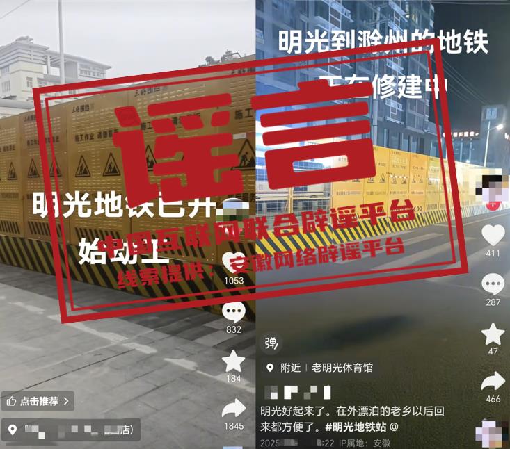 真相:近日,网民“张**”“沙**”等发布视频,编造并传播“明光地铁已开始动工”相关虚假信息,并配以误导性视频,引发关注和讨论。经核实,相关视频内容对应区域施工项目并非修建地铁,网传视频系谣言。明光市委网信办和市公安局已依法对张某、沙某等进行批评教育,并要求其删除相关不实信息。(来源:“安徽省互联网违法和不良信息举报”微信公众号、明光市委网信办)
