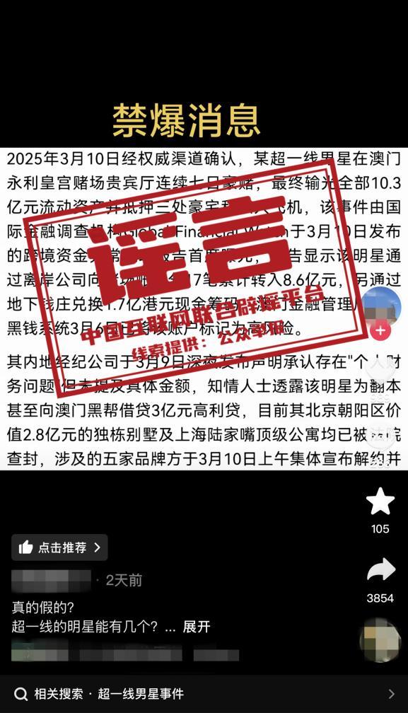 辟谣:使用AI捏造“顶流明星在澳门输了10亿”谣言,扰乱公共秩序,依法行政拘留