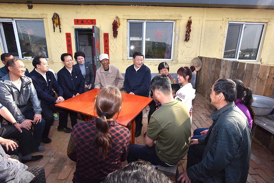 2019年4月15日,习近平在重庆市石柱土家族自治县中益乡华溪村村民、老党员马培清家中,同村民代表、扶贫干部围坐院中,共话脱贫攻坚。新华社记者 谢环驰 摄
