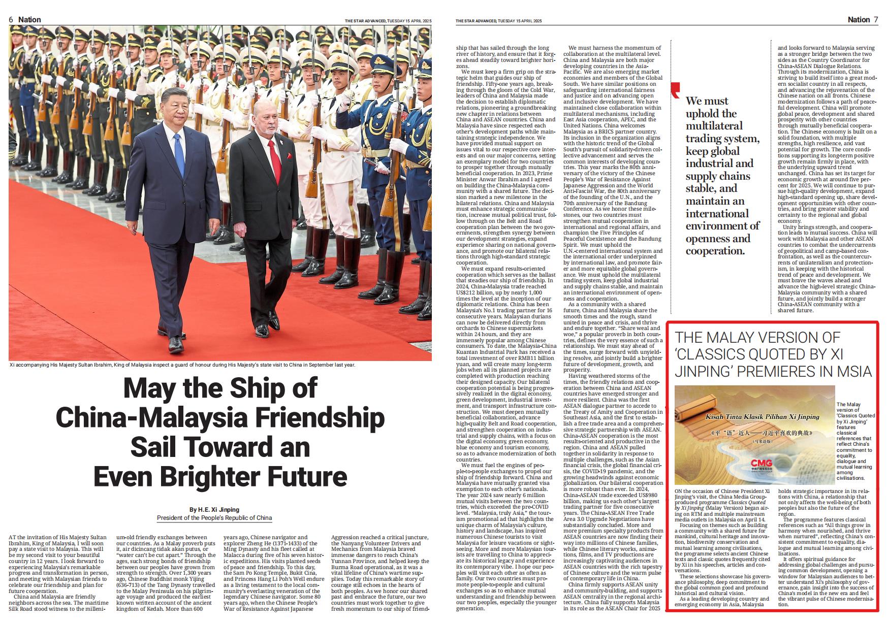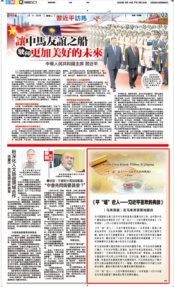 4月15日,马来西亚中文、英文、马来文主流媒体《星洲日报》《星报》《阳光日报》分别刊发节目在马来西亚落播的消息。文章指出,《平“语”近人——习近平喜欢的典故》(马来语版)特别选取了“万物各得其和以生,各得其养以成”等典故,生动阐释中国坚持不同文明之间平等交流、互学互鉴,愿意为人类破解时代难题、实现共同发展提供强大的精神指引,有助于马来西亚民众更好读懂新时代中国之治的成功密码,感知中国式现代化蓬勃发展的强劲脉动。