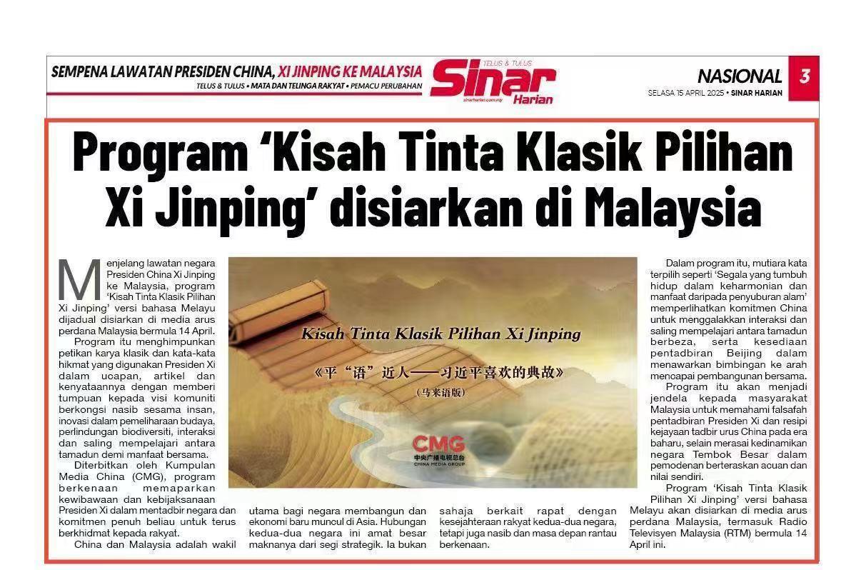 《平“语”近人——习近平喜欢的典故》(马来语版)将在马来西亚主流媒体落地播出