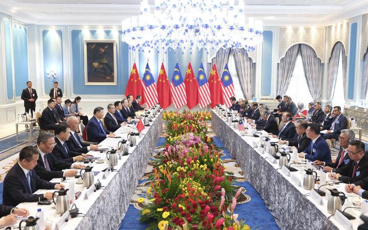 习近平指出,马方将今年东盟的主题定为“包容性和可持续性”,体现了对时局的深刻洞察。中方支持马来西亚发挥东盟轮值主席国作用,愿同地区国家一道,尽早签署中国-东盟自由贸易区升级议定书,以开放包容、团结合作抵制“脱钩断链”、“小院高墙”和滥征关税,以和平、合作、开放、包容的亚洲价值观回应弱肉强食的丛林法则,以亚洲的稳定性和确定性应对世界的不稳定和不确定。