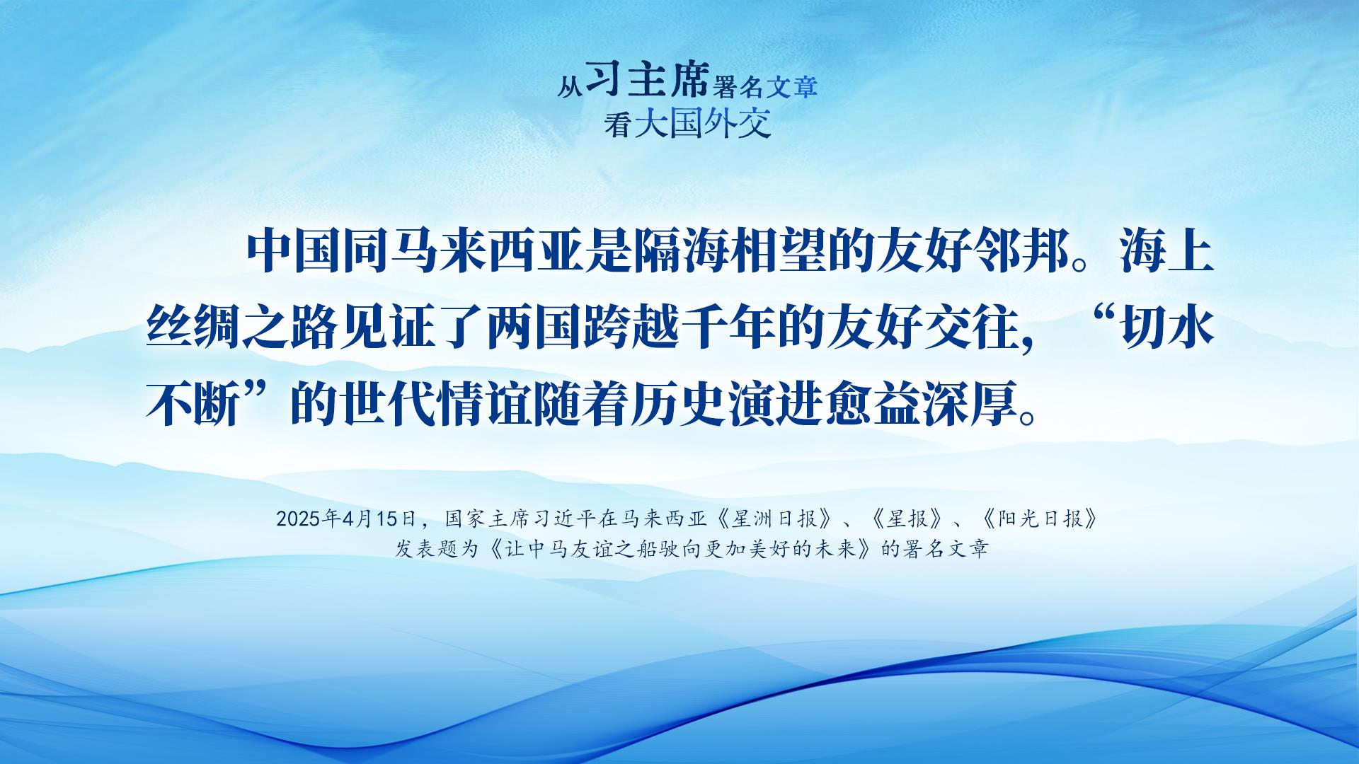 “中国同马来西亚是隔海相望的友好邻邦。海上丝绸之路见证了两国跨越千年的友好交往,‘切水不断’的世代情谊随着历史演进愈益深厚。”4月15日,在赴吉隆坡对马来西亚进行国事访问之际,习近平主席在马来西亚《星洲日报》、《星报》、《阳光日报》发表题为《让中马友谊之船驶向更加美好的未来》的署名文章中写道。