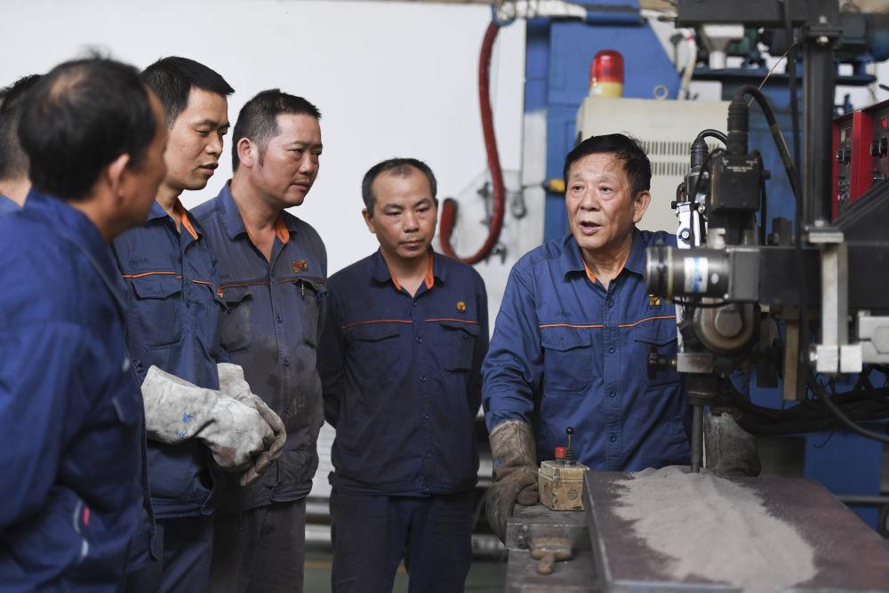 “金牌工人”窦铁成与工人交流(资料照片)。新华社发