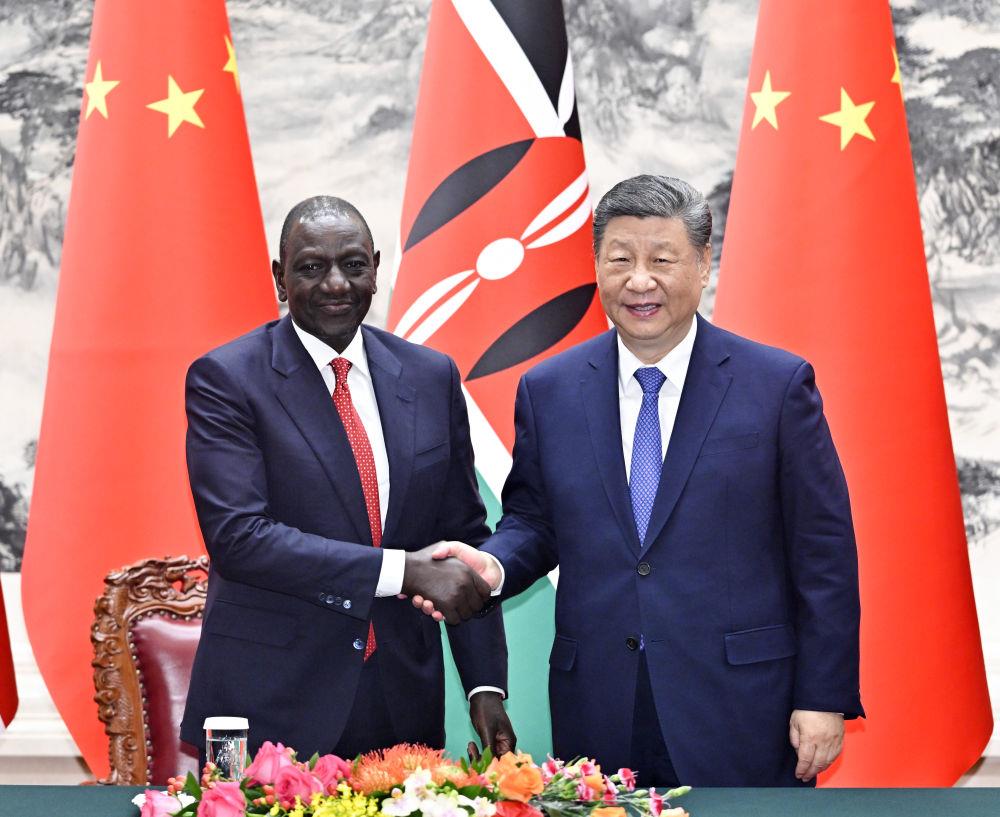 4月24日上午,国家主席习近平在北京人民大会堂同来华进行国事访问的肯尼亚总统鲁托举行会谈。这是习近平同鲁托握手。新华社记者 岳月伟 摄