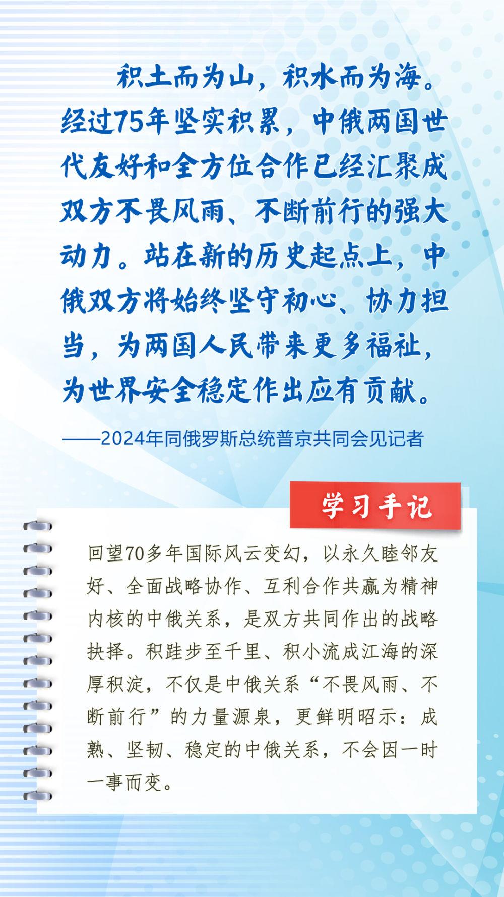 我们一起来学习品读这些饱含哲思的论述,从中感悟新时代中俄关系在复杂的外部环境下坚毅前行之道,感悟习近平主席作为大党大国领袖、世界级领袖的时代担当与天下情怀。