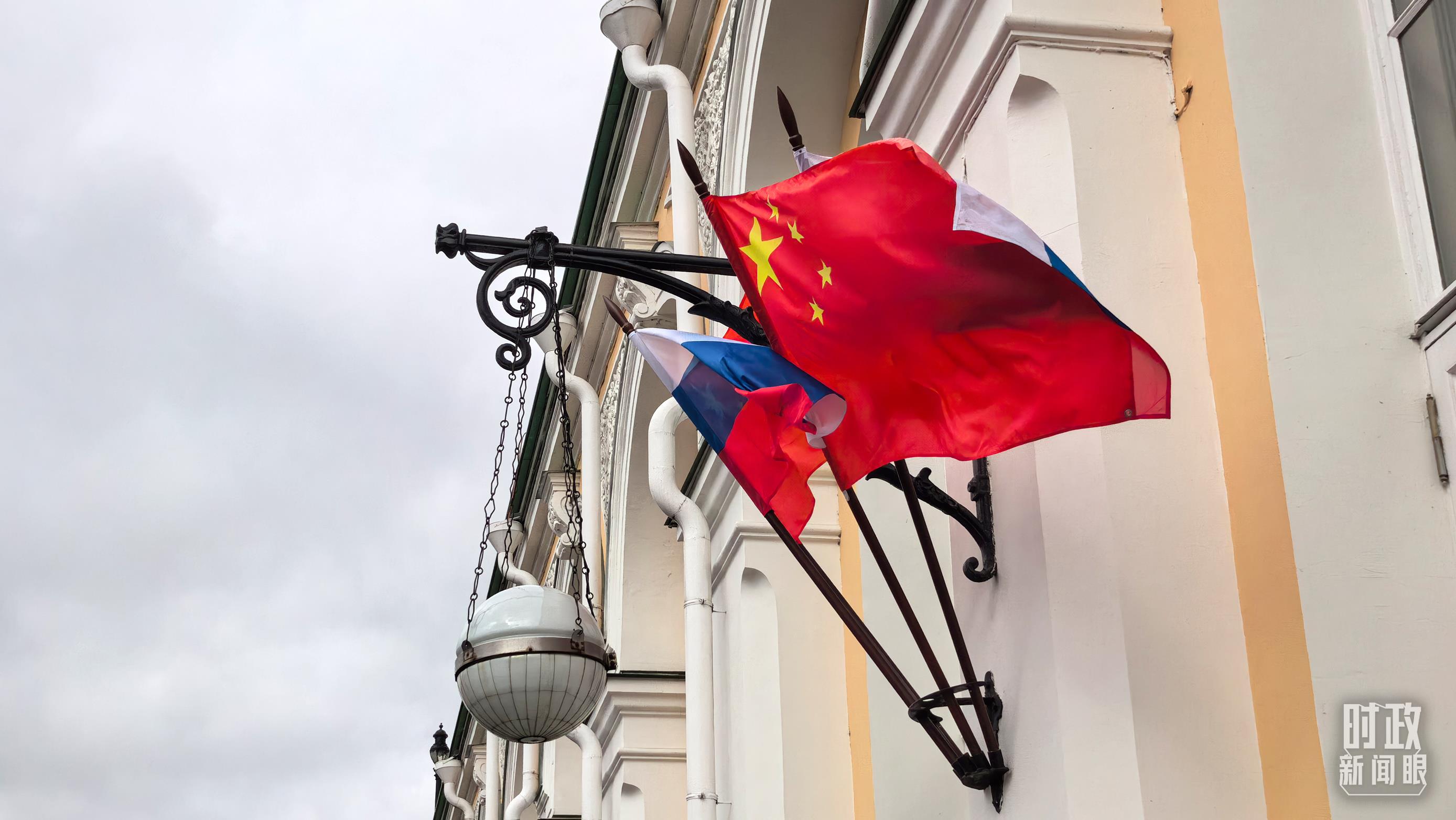 △下车处悬挂的中俄两国国旗。(总台央视记者刘琦拍摄)