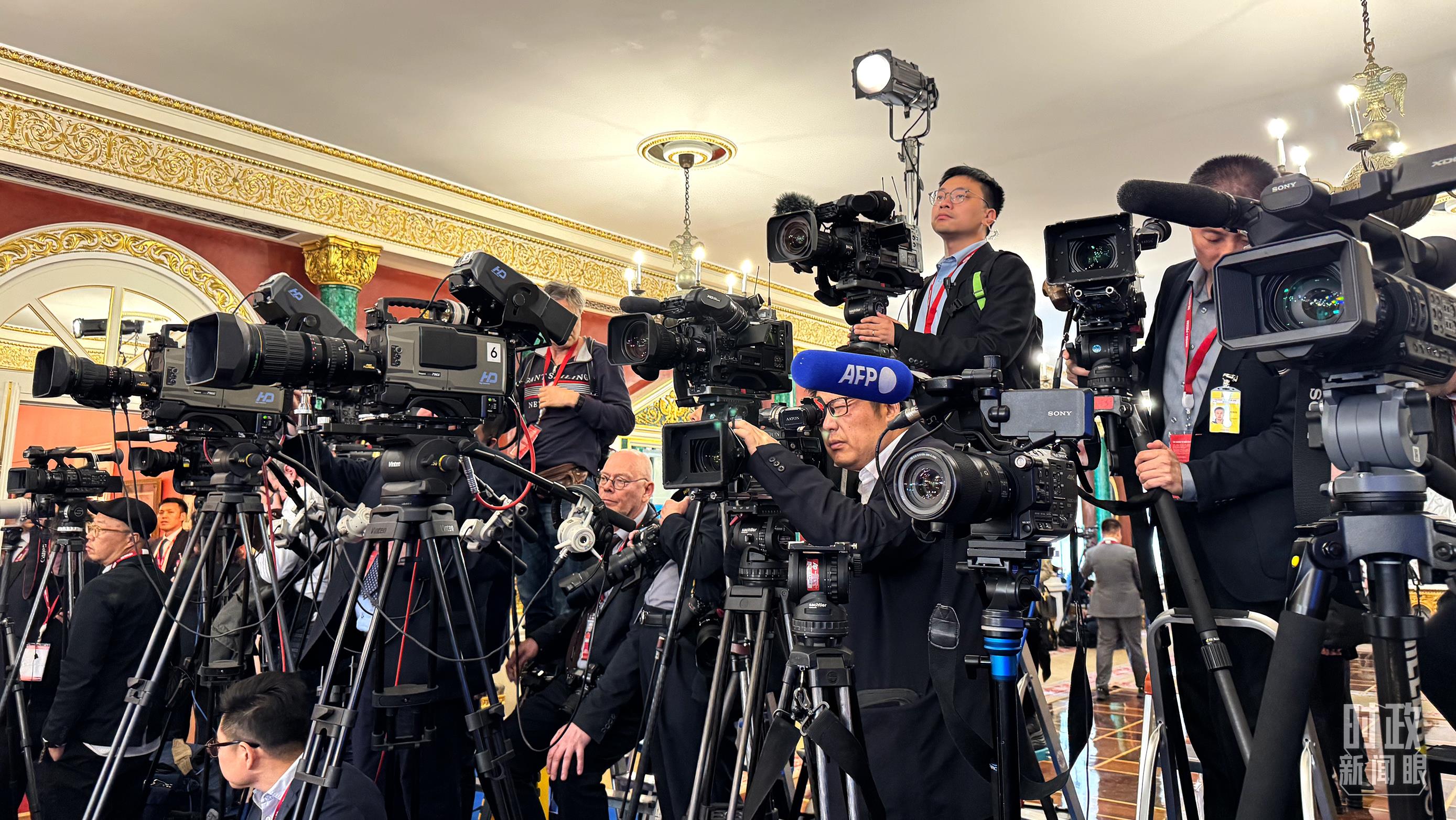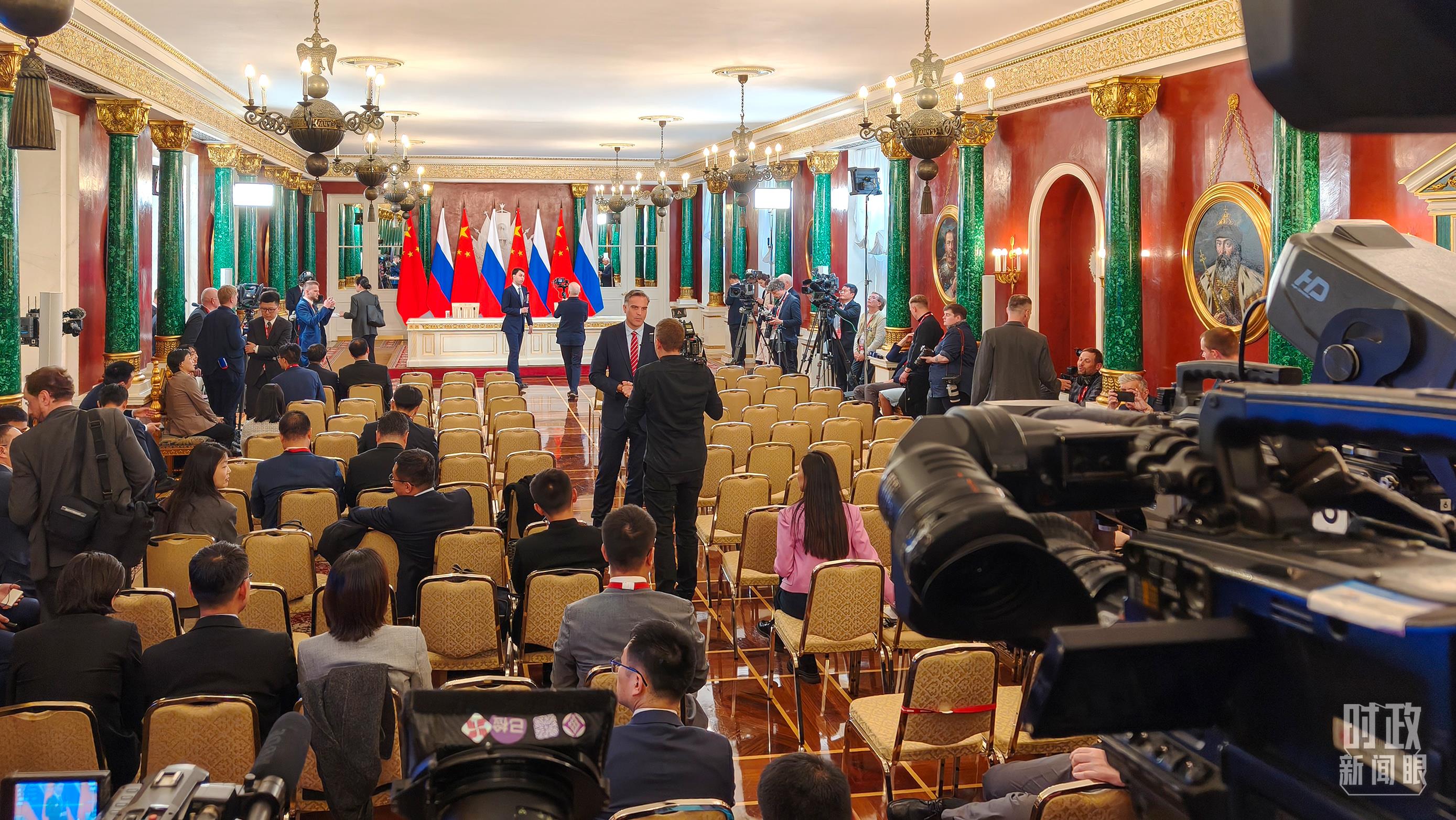 △等待中俄两国元首共见记者的中外媒体同仁。(总台央视记者陆泓宇、蒋硕拍摄)