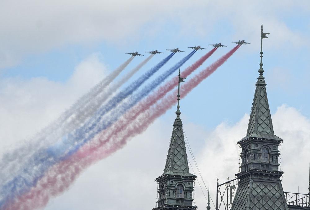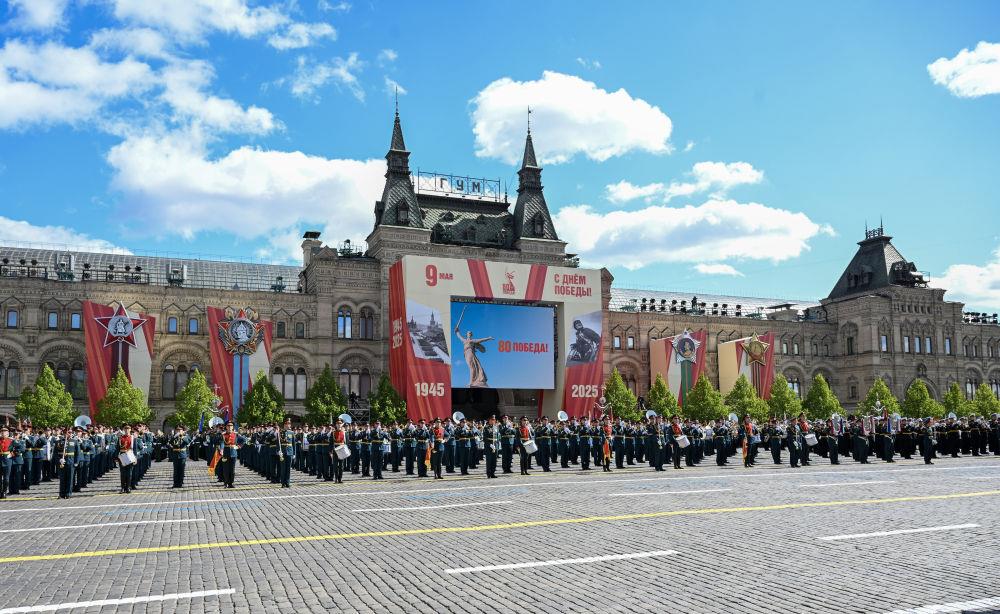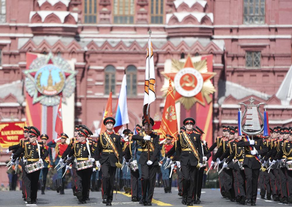 庆典上,中国人民解放军三军仪仗队方队军容严整、士气高昂,迈着坚定有力的步伐走过红场。
