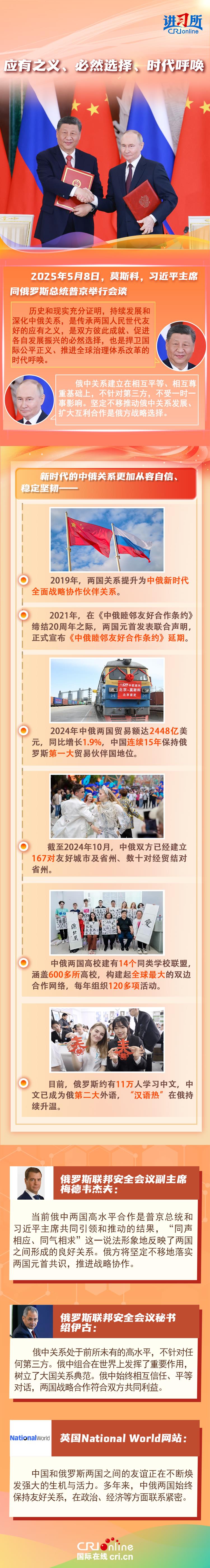 “两国人民用鲜血和生命凝结的深厚情谊,如黄河之水奔腾不息,似伏尔加河宽广深沉,成为中俄世代友好的不竭源泉。”今年是中国人民抗日战争、苏联伟大卫国战争暨世界反法西斯战争胜利80周年,也是联合国成立80周年。在这一重要历史时间节点,习近平主席此访不仅为中俄关系发展注入强劲动力,也向世界宣示中俄两国携手捍卫二战胜利成果的坚定意志。