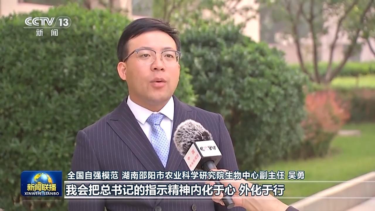 全国自强模范 湖南邵阳市农业科学研究院生物中心副主任 吴勇:我会把总书记的指示精神内化于心、外化于行,努力做好农作物种质资源收集、保存以及培育推广工作,让更多科技成果走出实验室,走进田间地头,为推动种业现代化建设农业强国作出我们农业科技工作者的贡献。