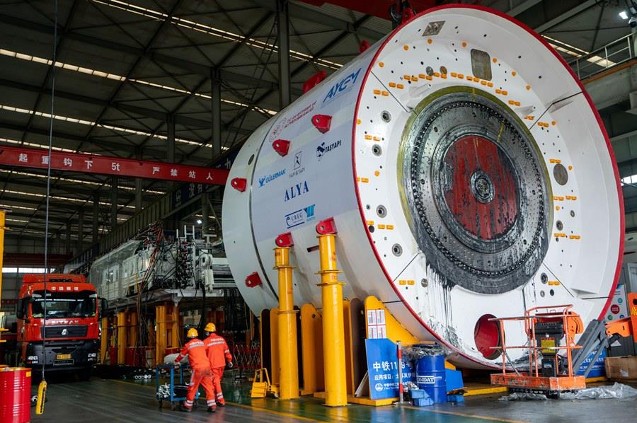 2022年11月23日,工人在中铁装备集团车间内运输掘进机零部件。新华社发