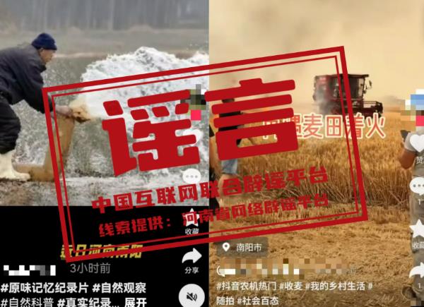 真相:近日,某平台用户发布视频称“南阳农民河道取水浇地被有关部门罚款5万元”,经向河南省南阳市水利局核实,今年南阳全市范围内未发生此类事件,且类似谣言信息早在2023年就已辟谣,该视频系旧谣新传。另有内容为“南阳市宛城区麦田着火”的信息也在网络上传播,引发网民关注。经宛城区网信部门核实,宛城区未发生麦田着火事件,该视频系以外地画面拼凑的谣言信息。(来源:河南省网络辟谣平台、南阳市互联网举报和辟谣平台)