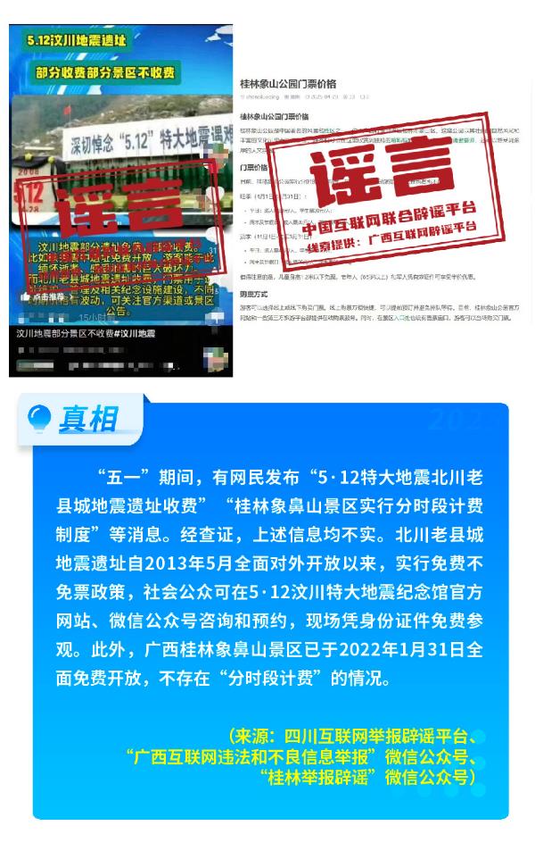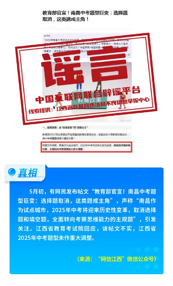 教育、文旅等领域谣言扰乱视听。部分账号假冒官方发布,在中考、公共假期等时点散布虚假信息。如“江西南昌2025年中考取消选择题和填空题”谣言,打着“教育部官宣”的旗号,引发家长群体过度担忧;另有部分商家瞄准社会公众对升学备考的关心,声称“中考体测使用‘氮泵’可提升成绩”“用体考神器考试开挂”,诱导家长购买对青少年身体可能造成伤害的产品。五一假期期间,有自媒体为蹭热点、涨流量,散布“广西漓江断流,游客徒步江底”谣言,实为对往年枯水期画面的恶意剪辑;“五一登顶泰山得3万奖金”“成都6月1日起公路停车位全面免费”等不实信息,误导广大游客,扰乱社会秩序。更有甚者,编造“5·12北川地震遗址收费”等虚假信息,引发公众议论和忧虑。5·12汶川特大地震纪念馆等机构快速回应、澄清谣言,出示免费政策文件,有效回应了网民关切。
