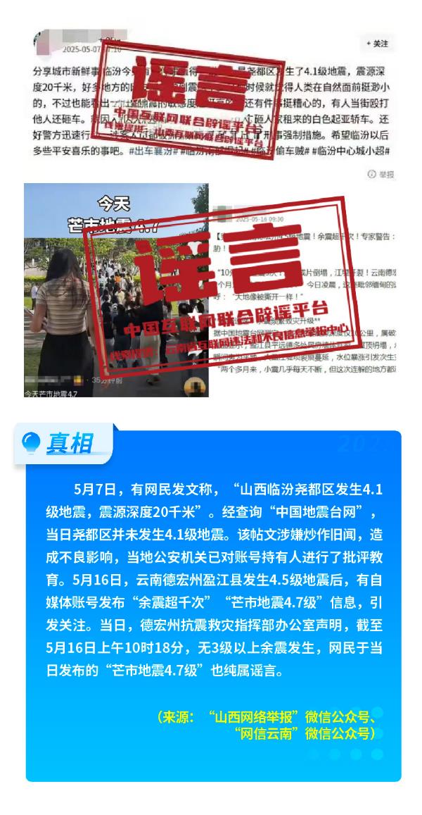 涉公共安全谣言成“重灾区”。一是涉灾害事故谣言多发,渲染情绪、制造混乱。5月中旬,多个自媒体账号密集发布“云南德宏州4.5级地震,余震超千次”“芒市地震4.7级”“山西临汾发生4.1级地震”等不实信息,渲染恐慌情绪;新疆伊犁霍城县山洪灾害后,有账号散布“洪水冲入主城区”“牲畜大批死亡”等不实视频,将其他地区洪灾画面与某养殖场病死牲畜处理场景拼凑,严重误导公众;所谓“安徽含山河道泄洪”的视频经核实为捏造,“河南安阳冰雹致小麦颗粒无收”虽拍摄下了当地冰雹天气片段,嫁接的却是虚假结论。二是个别网民为博取流量,自导自演、虚构事实,扰乱公共秩序。如“百万粉丝网红在成都自杀”事件,当事人为博关注编造戏剧性情节,伪造遗书、操纵评论,消耗社会同情心。