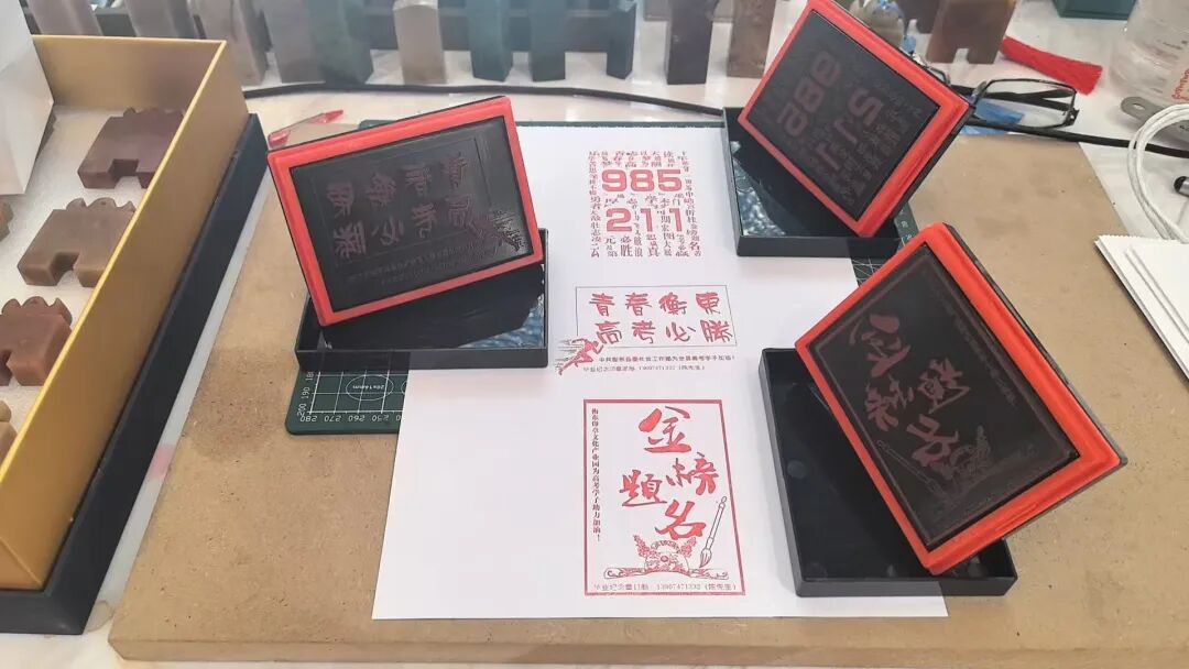 来自衡东印章产业园的“高考印章”把文化温度融入志愿服务,现场设置印章打卡点,考生和家长手持定制手牌,在精美的印章下打卡留念,“金榜题名”“985、211”等寓意美好的印章图案,不仅为考生送上了祝福,还让大家感受到了传统文化的魅力,增添了浓厚的文化氛围。
