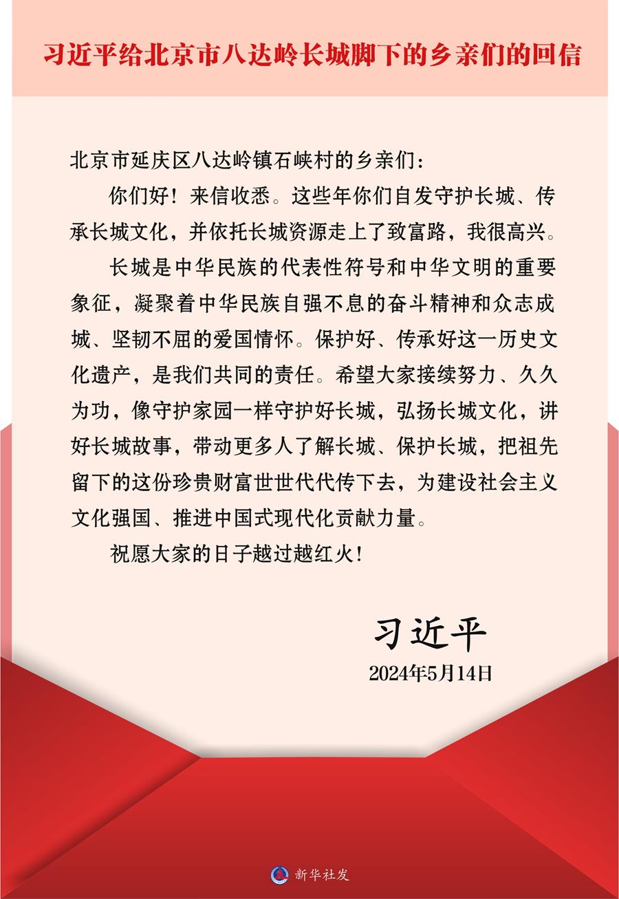 2024年,习近平总书记给北京市延庆区八达岭镇石峡村的乡亲们回信。这个村的乡亲们自发守护长城、传承长城文化,并依托长城资源走上了致富路。大家写信向习近平总书记汇报了这些情况。总书记回信勉励他们,像守护家园一样守护好长城,弘扬长城文化,讲好长城故事,带动更多人了解长城、保护长城,把祖先留下的这份珍贵财富世世代代传下去。